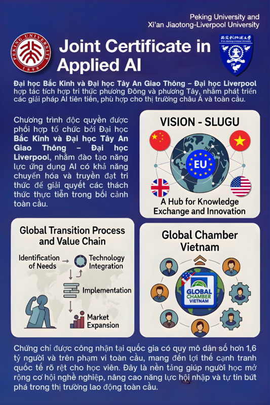 Chào mừng bạn đến với chương trình Joint Certificate in Applied AI Mastery – một khóa đào tạo nâng cao độc quyền, được thiết kế để trang bị cho các nhà lãnh đạo, doanh nhân và chuyên gia những kiến thức và kỹ năng thiết yếu nhằm phát triển và ứng dụng trí tuệ nhân tạo (AI) trong kinh doanh. Chương trình này giúp bạn xây dựng chiến lược AI hiệu quả, xử lý dữ liệu, triển khai mô hình và tích hợp công nghệ, tạo lợi thế cạnh tranh bền vững trong môi trường kinh doanh toàn cầu. Chương trình này là sự hợp tác chiến lược giữa các tổ chức uy tín thế giới: Đại học Bắc Kinh (PKUSRI), Đại học Xi’an Jiaotong-Liverpool (XJTLU), Phòng Thương mại Toàn cầu Việt Nam (GCV), và Mạng Lưới Đổi mới VISION – SLUGU.